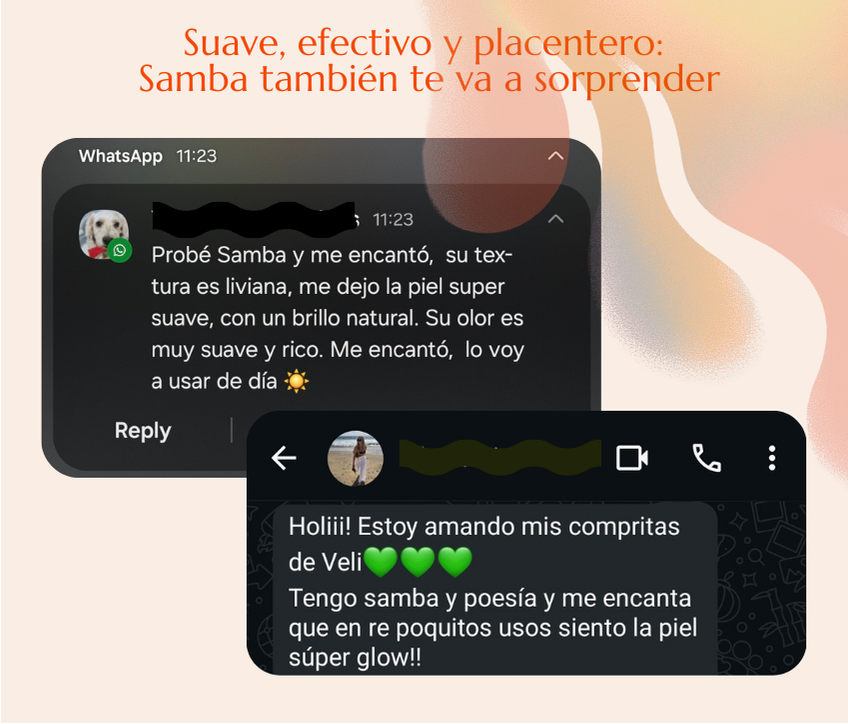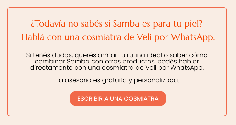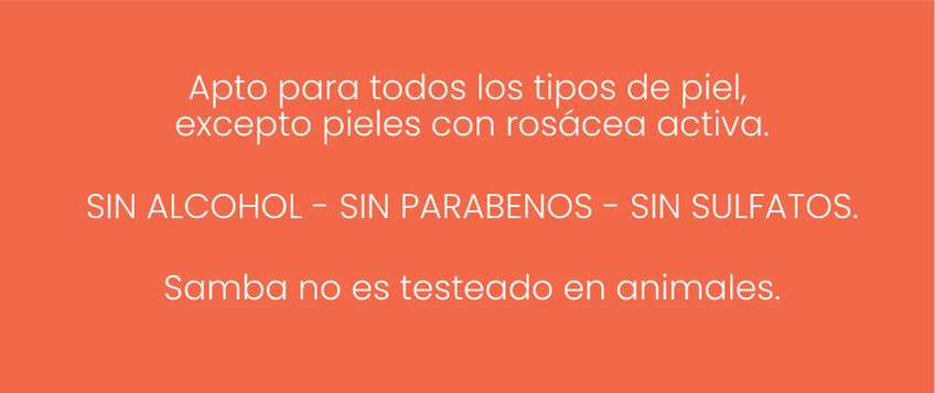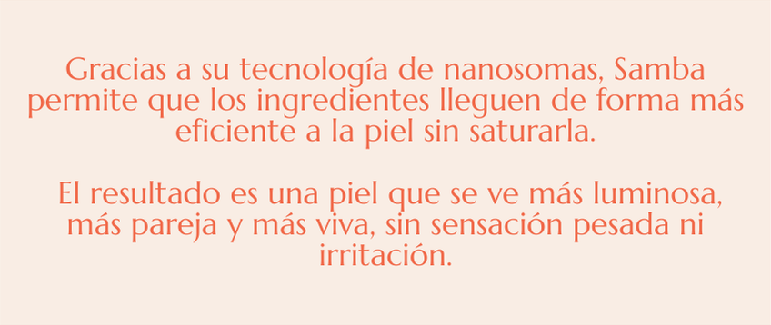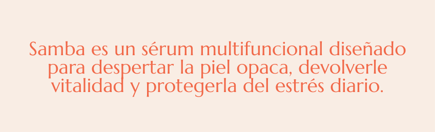Tu piel también se cansa y se apaga. Por eso creamos Samba, el sérum que le devuelve la energía y la vitalidad que pierde en el día a día. Es una verdadera bomba de antioxidantes y activos revitalizantes que trabajan para que tu piel se vea más luminosa, con un tono más parejo y una textura súper suave. Olvidate de la piel estresada; con Samba la vas a sentir hidratada, nutrida y visiblemente más despierta. Es el boost que necesitabas para un glow que no pasa desapercibido.