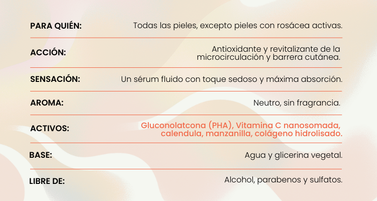 Apto para todos los tipos de piel, excepto pieles con rosácea activa.